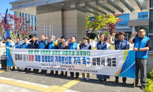 전북시군공무원노동조합연맹은 지난 8일 전주지방법원 앞에서 기자회견을 열고 유진우 전 의원이 법원에 제출한 '제명 집행정지 가처분 신청' 기각을 촉구했다. 뉴스1 |