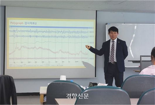 임금섭 백석대 범죄수사학 교수가 지난 10일 서울 서대문구 경기대 평생교육원에서 폴리그래프(거짓말탐지기) 검사의 실제 운용 과정을 설명하고 있다. 전현진 기자 |