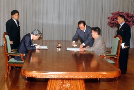 2004년 북일 정상회담 당시 고이즈미 준이치로 일본 총리(좌)와 김정일 당시 국방위원장(우)이 서류에 서명하고 있다. (출처 : 일본 외무성 누리집) |