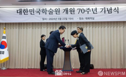 [서울=뉴스핌] 윤석열 대통령이 22일 서울 서초구 대한민국학술원에서 열린 개원 70주년 기념식에서 고 장석진 회원 배우자에게 국민훈장 무궁화장을 수여하고 있다. [사진=대통령실]2024.05.22 photo@newspim.com