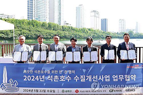(서울=연합뉴스) 롯데가 지난 22일 송파구청과 함께 '2024 석촌호수 수질 개선' 업무 협약식을 진행했다고 23일 밝혔다. 사진은 협약식 체결 후 기념 촬영하는 김만구 녹색미래 대표(왼쪽부터), 김상우 롯데백화점 잠실점장, 감동훈 롯데칠성음료 커뮤니케이션부문장, 서강석 송파구청장, 최영 롯데물산 경영전략부문장, 최용환 롯데GRS ESG부문장, 류영근 젠스 대표이사. 2024.5.23 [롯데물산 제공. 재판매 및 DB 금지]