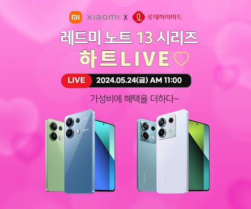'하트라이브'는 하이마트 라이브 방송의 약자로, 소비자와 실시간 소통하며 제품을 판매하는 모바일 생방송 판매 서비스다. 하트라이브 생방송은 롯데하이마트 자체 모바일 앱에서 24일 오전 11시에 진행된다. 해당 라이브는 방송 1시간 동안 '레드미 노트 13 일반/프로 모델'을 7% 할인된 가격에 판매한다. 또한 방송 중 제품을 구매한 소비자들에게 투명 케이스와 액정 보호필름을 사은품으로 증정할 예정이다.
