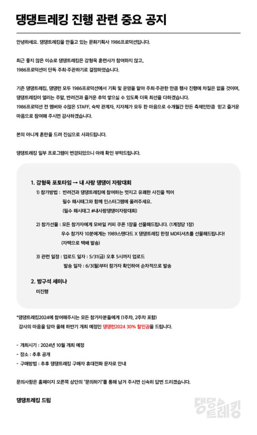 논란이 커지자 강 씨가 고정출연 중인 KBS 프로그램 '개는 훌륭하다'는 결방되었다. 그리고, 강형욱의 출연이 예정되어있던 '댕댕 트래킹' 행사에 강형욱이 불참한다고 강원특별자치도 정선군은 밝혔다.