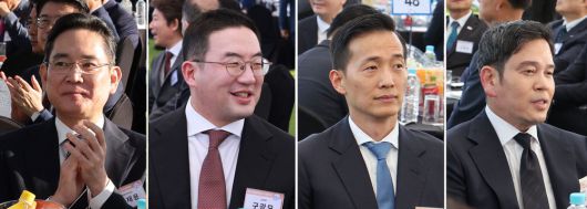 중기지원 힘 싣는 대기업 총수들 23일 오후 서울 용산 대통령실 잔디마당에서 열린 '2024 대한민국 중소기업인대회'에 이재용 삼성전자 회장, 구광모 LG그룹 회장, 김동관 한화그룹 부회장, 정용진 신세계그룹 회장(왼쪽부터) 등 6대 대기업 총수와 스타트업 관계자 등 500여 명이 참석했다. 이승환 기자 |