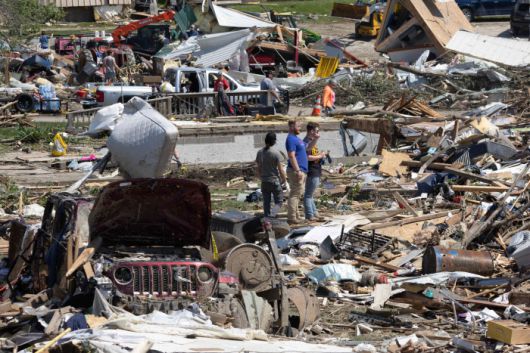 지난 21일(현지시간) 초강력 토네이도가 휩쓸고 간 미국 아이오와주 그린필드의 주민들이 22일 쑥대밭이 된 마을에서 상황을 살펴보고 있다. AFP연합뉴스 |
