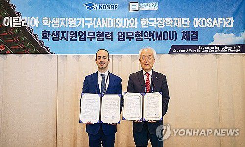 (서울=연합뉴스) 배병일 한국장학재단 이사장과 이탈리아 국립학업지원협회(ANDISU) 알레산드로 치로 시레티 회장이 지난 23일 대구 엑스코에서 열린 국제학생지원연합(IASAS) 글로벌 서밋 행사장에서 인적교류 및 정보교류 등 협력체계 구축 추진 관련 업무협약을 체결 후 기념 촬영하고 있다. 2024.5.24 [한국장학재단 제공. 재판매 및 DB 금지]
