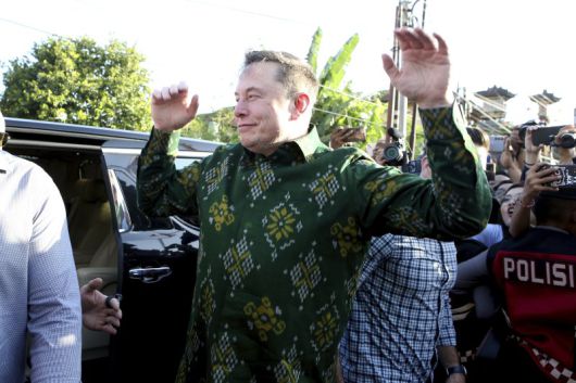 미국 민간 우주기업 스페이스X의 일론 머스크 최고경영자(CEO·가운데)가 19일 스페이스X의 위성인터넷 서비스인 '스타링크' 개통을 축하하기 위해 인도네시아 발리를 방문해 시민들에게 인사하고 있다.AP뉴시스 |