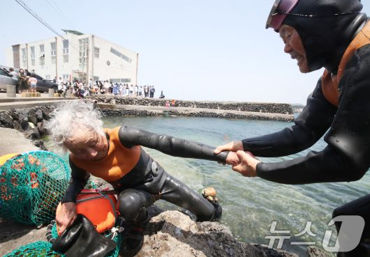(제주=뉴스1) 오현지 기자 = 25일 오후 제주시 한림읍 귀덕2리 어촌계 인근 바다에서 마지막 물질을 마친 강두교 어르신이 김유생 어르신의 손을 잡아주고 있다. 귀덕2리 어촌계와 제주해녀문화예술연구협회는 이날 제주해녀 9명의 은퇴식 '마지막 물질'을 열었다. 2024.5.25/뉴스1