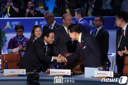 윤석열 대통령이 17일(현지시간) 미국 샌프란시스코 모스코니센터에서 열린 아시아태평양경제협력체(APEC) 정상회의 두 번째 세션 리트리트(retreat)에서 기시다 후미오 일본 총리와 악수하고 있다. (대통령실 홈페이지) 2023.11.18/뉴스1 ⓒ News1 오대일 기자 |