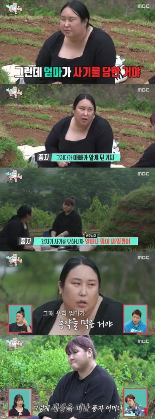 어머니를 찾아가던 중 풍자는 "동네에 허름한 피자집이 있었다. 우리 가족이 외식 날이면 항상 피자를 시켰다. 다 같이 피자를 먹는데 엄마는 늘 피자 꽁다리만 드셨다"며 이야기를 이어갔다.
