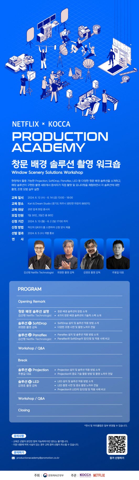올해 넷플릭스와 콘진원이 공동 주관하는 ‘Netflix x KOCCA Production Academy’는 6월부터 12월까지 총 8개의 교육 과정을 통해 전문 인력을 양성할 계획이다.