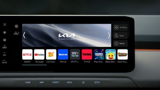 기아 EV3는 차량용 웹OS로 모바일이나 TV로 즐기던 다양한 콘텐츠를 운전석과 보조석에서 실시간 스트리밍으로 감상할 수 있다. .