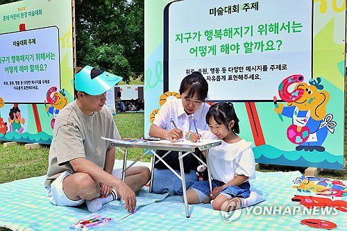 (서울=연합뉴스) 지난 25일 서울 송파구 올림픽공원 피크닉장에서 열린 제42회 롯데 어린이 환경 미술대회에서 한 가족이 그림을 그리고 있다. 2024.5.26 [롯데백화점 제공. 재판매 및 DB 금지]
