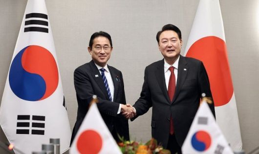 | 지난해 11월 기시다 일본 총리와 악수하는 윤석열 대통령 / 사진=연합뉴스 |