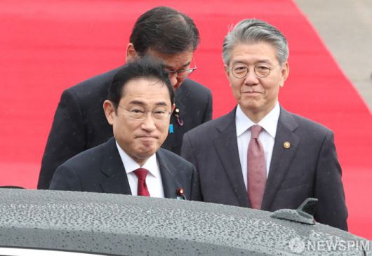 [성남=뉴스핌] 이호형 기자 = ‘한중일 정상회담’ 차 입국한 일본 기시다 총리가 26일 성남 서울공항서 김홍균 외교부 제1차관과 사열을 받으며 차량으로 이동하고 있다. 2024.05.26 leemario@newspim.com |