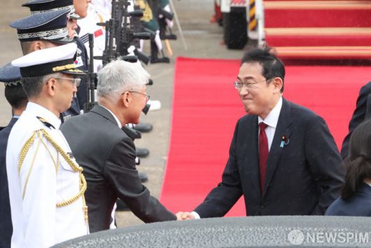 [성남=뉴스핌] 이호형 기자 = ‘한중일 정상회담’ 차 입국한 일본 기시다 총리가 26일 성남 서울공항서 일본측 환영 참석자와 인사를 나누고 있다. 2024.05.26 leemario@newspim.com |