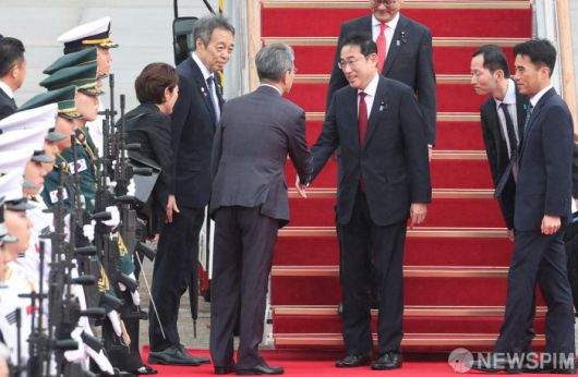 [성남=뉴스핌] 이호형 기자 = ‘한중일 정상회담’ 차 입국한 일본 기시다 총리가 26일 오후 성남 서울공항서 김홍균 외교부 제1차관과 인사를 나누고 있다. 2024.05.26 leemario@newspim.com |
