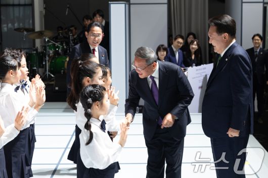 윤석열 대통령과 기시다 후미오 일본 총리, 리창 중국 총리가 26일 서울 종로구 국립현대미술관에서 열린 제9차 한일중 정상회의 환영 만찬에서 3국 어린이 합창단의 식전 공연이 끝난 후 무대로 올라가 공연단 어린이들을 격려하고 있다. (대통령실 제공) 2024.5.26/뉴스1 ⓒ News1 오대일 기자 |