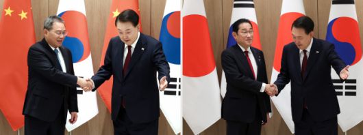 윤석열 대통령이 26일 서울 용산 대통령실에서 리창 중국 국무원 총리(사진 왼쪽), 기시다 후미오 일본 총리와 각각 양자 회담을 하며 악수하고 있다. |