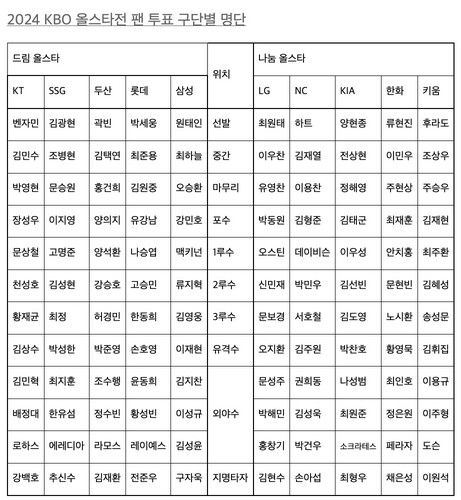 KBO는 27일 오전 10시부터 시작되는 2024 신한 SOL뱅크 KBO 올스타전에 출전할 ‘베스트12’를 선정하는 구단별 팬 투표 명단을 발표했다.