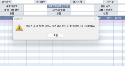 27일 금융투자업계에 따르면 이날 오전 10시50분경 삼성증권 MTS '엠팝'(mPOP)과 홈트레이딩서비스(HTS) 모두에서 서비스 장애가 발생했다. 접속 자체에는 문제가 없었으나 계좌 잔고 확인이 불가능하고 종목 매매가 불가했다.