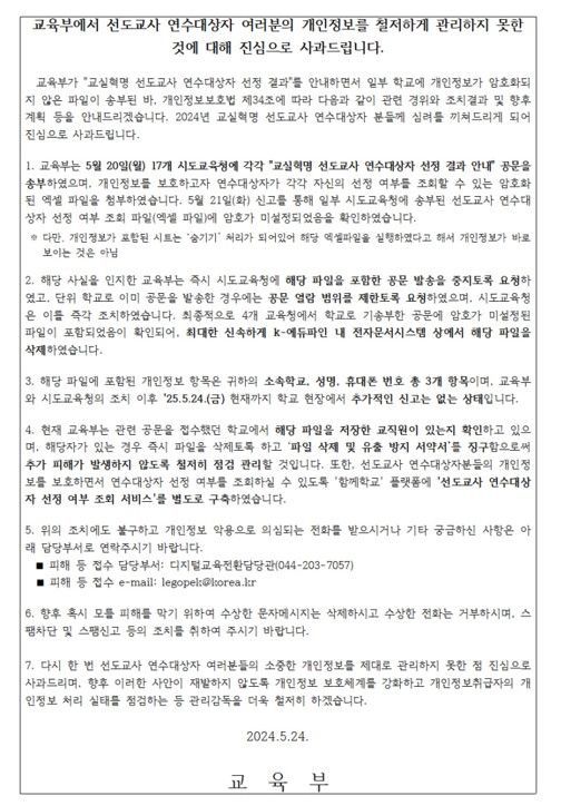교육부는 해당 지역 교사들의 신고를 받고 개인정보가 담긴 파일을 삭제하는 한편 이미 파일을 다운로드 받은 교사들에게는 외부에 유출하지 말아 줄 것을 당부했다. 이어 지난 23일 선도교사 연수 현장에서 개인정보유출에 대해 공식 사과했다.