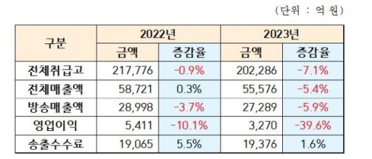 전체 매출액 대비 방송매출액 비중은 2021년까지 50%대를 유지했으나 2022년 49.4%, 지난해 49.1%로 작아졌다. 영업이익률도 2021년 10.3%에서 2022년 9.2%에 이어 지난해 5.9%로 낮아졌다.