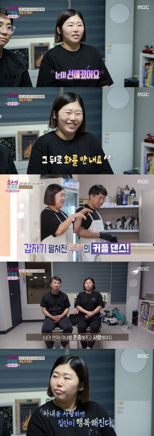 앞서 아내는 쉬는 시간 가게에서 춤 연습을 하기도 했다. 당시에는 남편의 눈치를 보느라 한껏 주눅 든 모습이었지만 이제는 커플 댄스를 선보일 정도로 훈훈한 분위기를 자랑했다. 남편은 “제가 바뀌지 않고 남이 바뀌길 원하면 제자리걸음인 것 같다. 아내를 존중하고 사랑해야지 집이 돌아갈 수 있다는 걸 늦게 깨달았다. 아내를 사랑하면 집안이 행복해진다”라고 말해 아내를 흐뭇하게 했다.