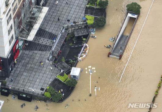 [ AP/뉴시스] 지난 해 9월 6일 중국 남동부 푸젠성 푸저우 시내가 제11호 태풍 '하이쿠이'에 뒤따른 홍수로 침수돼 있다. 안후이성에서는 5월 27일 폭우로 약화된 아파트가 무너져 최소 4명이 사망했다고 중국매체들이 보도했다. 2024.05.28. |