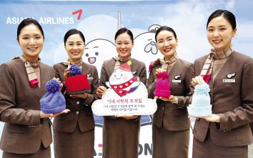 아시아나항공은 고객 참여 사회공헌 활동 ‘기내 사랑의 뜨개질’을 코로나19 이후 4년 만에 재개했다고 28일 밝혔다. 일부 장거리 항공편 승객들에게 손쉽게 참여할 수 있는 뜨개질 키트를 나눠주고 있으며, 완성된 모자와 목도리는 몽골 울란바토르 보육시설 어린이들에게 전달될 예정이다. 승무원들이 캠페인 키트로 완성된 털모자를 들고 기념 촬영을 하고 있다. 김지윤 기자 |