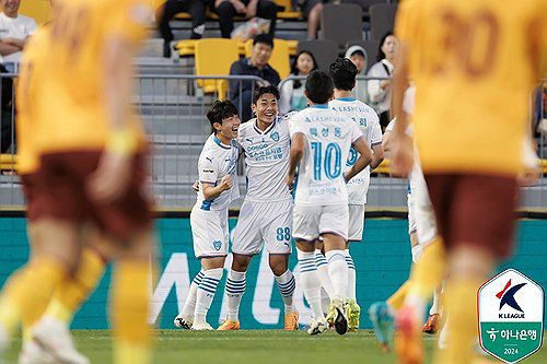 포항은 28일 광주축구전용구장에서 열린 광주FC와의 하나은행 K리그1 2024 15라운드 원정 경기에서 전반 5분 만에 터진 김동진의 한 골을 지켜 1-0으로 이겼다. 사진은 이날 김동진의 골에 기뻐하는 포항 선수들. 2024.5.28 [한국프로축구연맹 제공. 재판매 및 DB 금지]