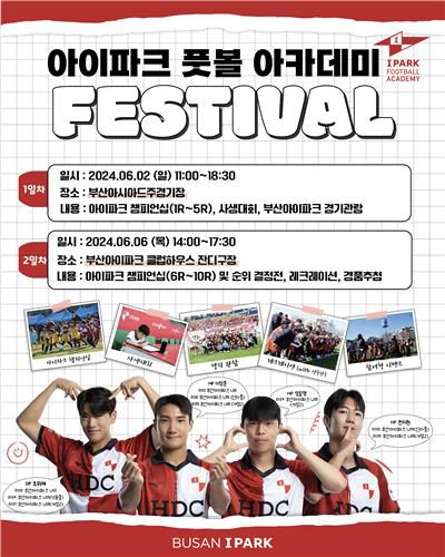 (서울=연합뉴스) 이영호 기자 = 프로축구 K리그2 부산 아이파크가 6월 2일과 6일, 2회에 걸쳐 아이파크 풋볼 아카데미 회원과 가족을 포함해 1천500명이 참가하는 페스티벌을 연다고 29일 밝혔다.