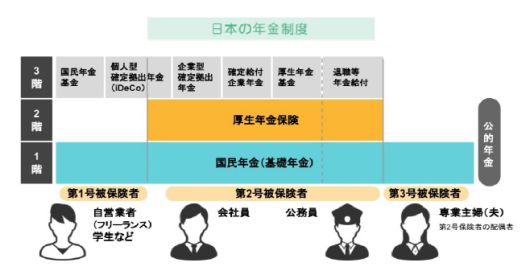 일본의 연금제도는 '국민연금(노령연금)-퇴직연금-개인연금'으로 구성된 한국과 달리 정액을 지급하는 기초연금인 '국민연금'과 소득에 비례하는 '후생연금', 공적연금 성격을 띠고 있지만 민간이 관리를 대행하는 '후생연금기금' 등 3층 구조로 설계돼 있다.