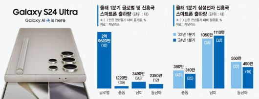 올 1·4분기 삼성전자의 남미 점유율은 전년 동기 대비 17% 역성장한 25%를 기록했다. 2위인 트랜션(22%)과의 격차도 줄었고, 출하량도 380만대에서 310만대까지 감소했다. 다만 평균판매가(ASP)는 19% 상승했다. 카날리스는 "갤럭시AI가 담긴 갤럭시S24 시리즈 판매에 적극 나서면서 ASP가 올랐다"며 "해당 시리즈에서 갤럭시S24울트라가 66%를 차지한다"고 설명했다.