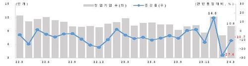 반면 지난 3월 창업기업은 10만6천개로 고금리, 고물가 등의 영향으로 제조업(-13.6%), 건설업(-8.8%), 서비스업(-10.4%) 등 주요 업종에서 크게 줄며 지난해 동월보다 10.7% 감소했다.