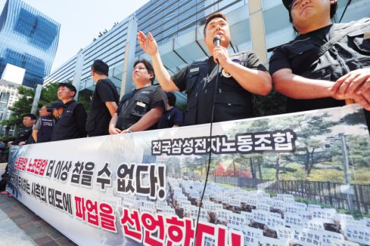 전국삼성전자노동조합이 29일 오전 서울 서초구 삼성전자 서초사옥 앞에서 파업 선언 기자회견을 갖고 있다. 김민지 기자 |