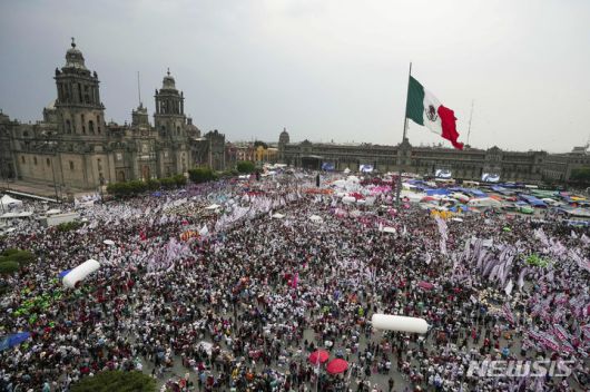 [멕시코시티=AP/뉴시스] 멕시코 대선 유세 마지막 날인 29일(현지시각) 수도 멕시코시티의 소칼로 광장에서 열린 클라우디아 셰인바움 대선 후보의 유세 현장에 지지자들이 모여 있다. 멕시코 좌파 집권당 국가재생운동당(모레나)의 셰인바움 후보는 오는 6월 2일 치러질 대선 투표에서 멕시코 최초의 여성 대통령 당선이 유력시된다. 2024.05.30.