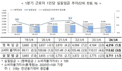 올해 1분기 근로자 1인당 월평균 실질임금은 371만1천원으로, 작년 1분기 377만5천원보다 6만4천원 줄었다.