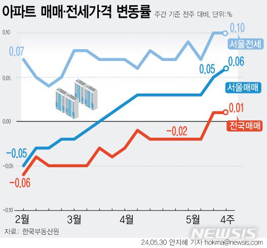 30일 한국부동산원에 따르면 5월 넷째주(27일 기준) 전국 주간 아파트가격 동향을 조사한 결과 매매가격이 0.01% 상승해 전주와 같은 수준을 유지했다. 수도권(0.02%→0.03%) 및 서울(0.05%→0.06%)은 상승폭 확대, 지방(0.00%→-0.01%)은 하락 전환했다.