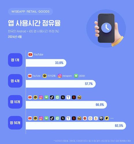 30일 앱·리테일 분석 서비스 와이즈앱·리테일·굿즈가 국내 스마트폰 사용자를 표본 조사한 결과, 지난 4월 한국인이 가장 오래 사용한 앱은 유튜브로 전체 스마트폰 앱 사용 시간의 33.6%로 분석됐다.