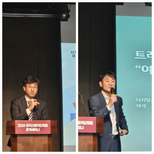 이성복 자본시장연구원 박사(사진 왼쪽)와 이석 하나카드 디지털금융그룹장이 '2024 한국신용카드학회 춘계세미나'에서 발표를 하고 있다. 사진=김예지 기자 촬영 |