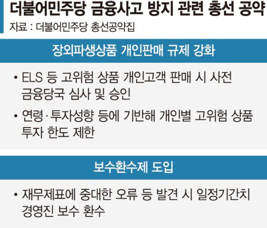 30일 금융권 및 국회에 따르면 민주당은 원 구성 이후 △장외파생상품 개인판매 규제 강화 △금융회사 경영진 대상 보수환수제 도입 △여신전문회사 및 신용협동조합 금융사고 제재근거 강화 등의 금융사고 재발방지책을 추진할 예정이다. 특히 홍콩항셍기업지수(H지수) 기초 주가연계증권(ELS) 대규모 손실 사태 후 금융회사의 고위험·고난도 투자상품 판매에 대한 규제를 강화할 것으로 예상된다. ELS 상품을 개인 고객에게 판매할 때 사전에 금융당국의 심사와 승인을 받도록 하는 '사전승인제' 도입과 고객 연령·투자성향·경험 등에 기반해 개인이 한 은행에서 투자할 수 있는 고위험·고난도 상품 상한비율을 정해두는 규제 도입이 구체적인 내용이다.