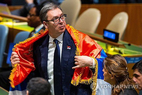 세르비아 수도 베오그라드에서 유엔 총회 생중계를 지켜본 정부 관계자들도 국기를 몸에 둘렀다.