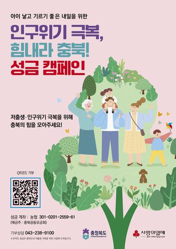 한편, 성금모금 참여는 성금 기부를 희망하는 누구든지 충북사회복지공동모금회의 '저출생·인구위기 극복 성금모금' 계좌로 입금하거나, 충북사회복지공동모금회 인터넷 홈페이지와 개인 휴대전화로 성금모금 큐알코드에 접속하면 신용카드 등으로 쉽게 기부할 수 있고, 참여자는 연말 세액공제 혜택이 제공된다.
