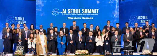 22일 오후 서울 성북구 한국과학기술연구원(KIST)에서 열린 'AI 서울 정상회의 장관 세션'에서 이종호 과학기술정보통신부 장관과 미셀 더넬런 영국 과학혁신기술부 장관 등 참석자들이 기념촬영을 하고 있다. (과학기술정보통신부 제공) 2024.5.22/뉴스1 |
