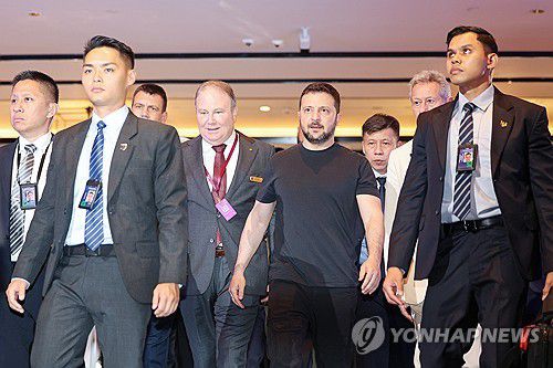 (싱가포르=연합뉴스) 신현우 기자 = 볼로디미르 젤렌스키 우크라이나 대통령이 1일(현지시간) 제21차 아시아 안보회의(샹그릴라 대화)가 열리는 싱가포르 샹그릴라 호텔로 들어서고 있다. 2024.6.1
