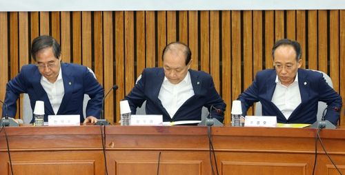 왼쪽부터 한덕수 국무총리, 황우여 국민의힘 비상대책위원장, 추경호 국민의힘 원내대표가 2일 서울 여의도 국회에서 열린 제17차 고위당·정협의회에 참석하고 있다. [사진=연합뉴스] |