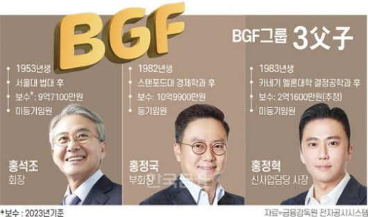 지난해 BGF그룹으로부터 홍석조 회장, 홍정국 부회장, 홍정혁 사장 등 3부자가 받은 보수 총액은 22억8600만원이다. 등기(사외이사, 감사위원회 위원 제외)임원과 미등기 임원 보수 총액 28억4700만원에서 3부자 보수는 80%를 차지한다.