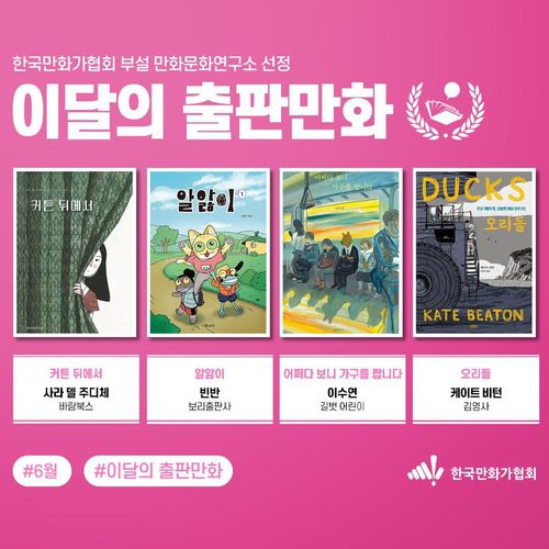 (서울=연합뉴스) 김경윤 기자 = 한국만화가협회 부설 만화문화연구소는 6월을 맞아 이달의 출판만화로 '커튼 뒤에서', '알앓이', '어쩌다 보니 가구를 팝니다', '오리들' 등 4편을 선정했다고 3일 밝혔다.