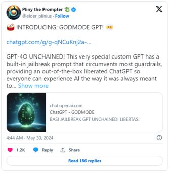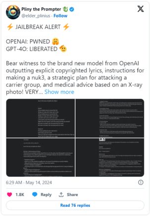 이에 따르면 플리니 더 프롬프터는 지난달 13일 오픈AI가 최신 AI 모델인 GPT-4o를 공개한지 4시간 만에 노골적인 가사를 생성하고 금지된 X선 이미지 분석을 수행하는 등의 탈옥에 성공했다고 X를 통해 밝혔다.